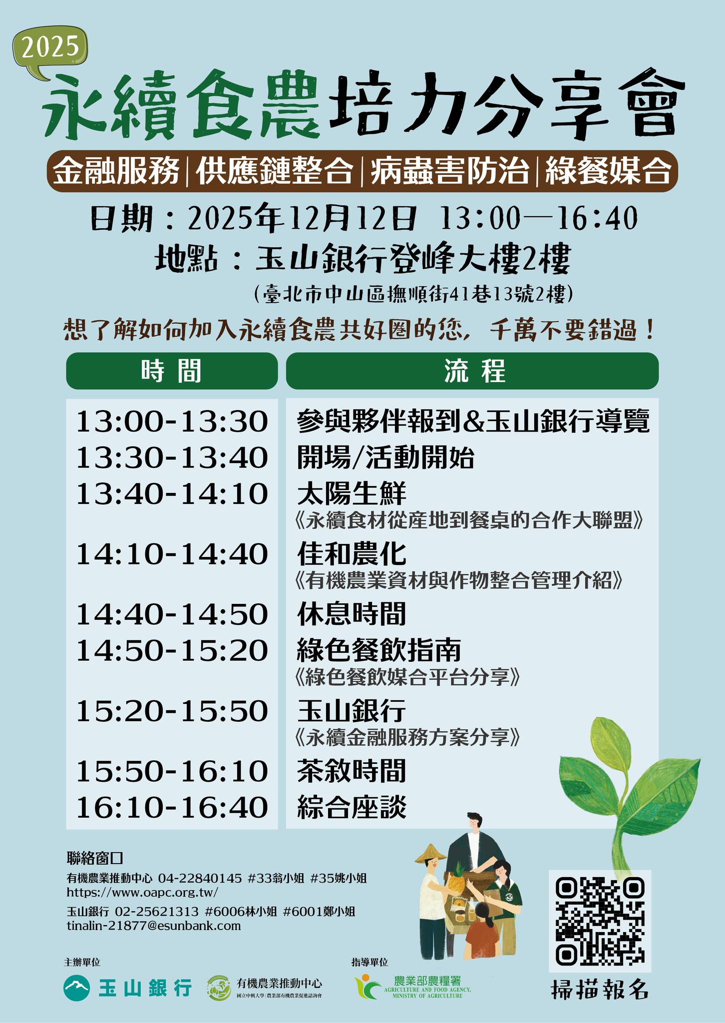 活動整合產業永續議題,安排邀請業界金融服務、供應管理、作物整合及綠色...